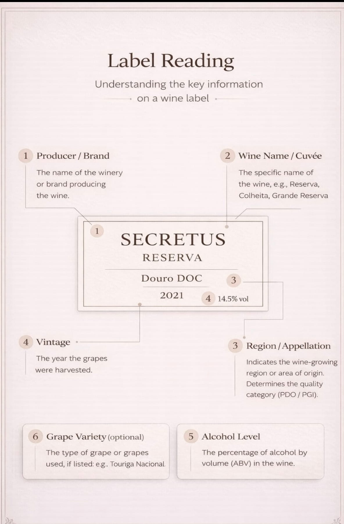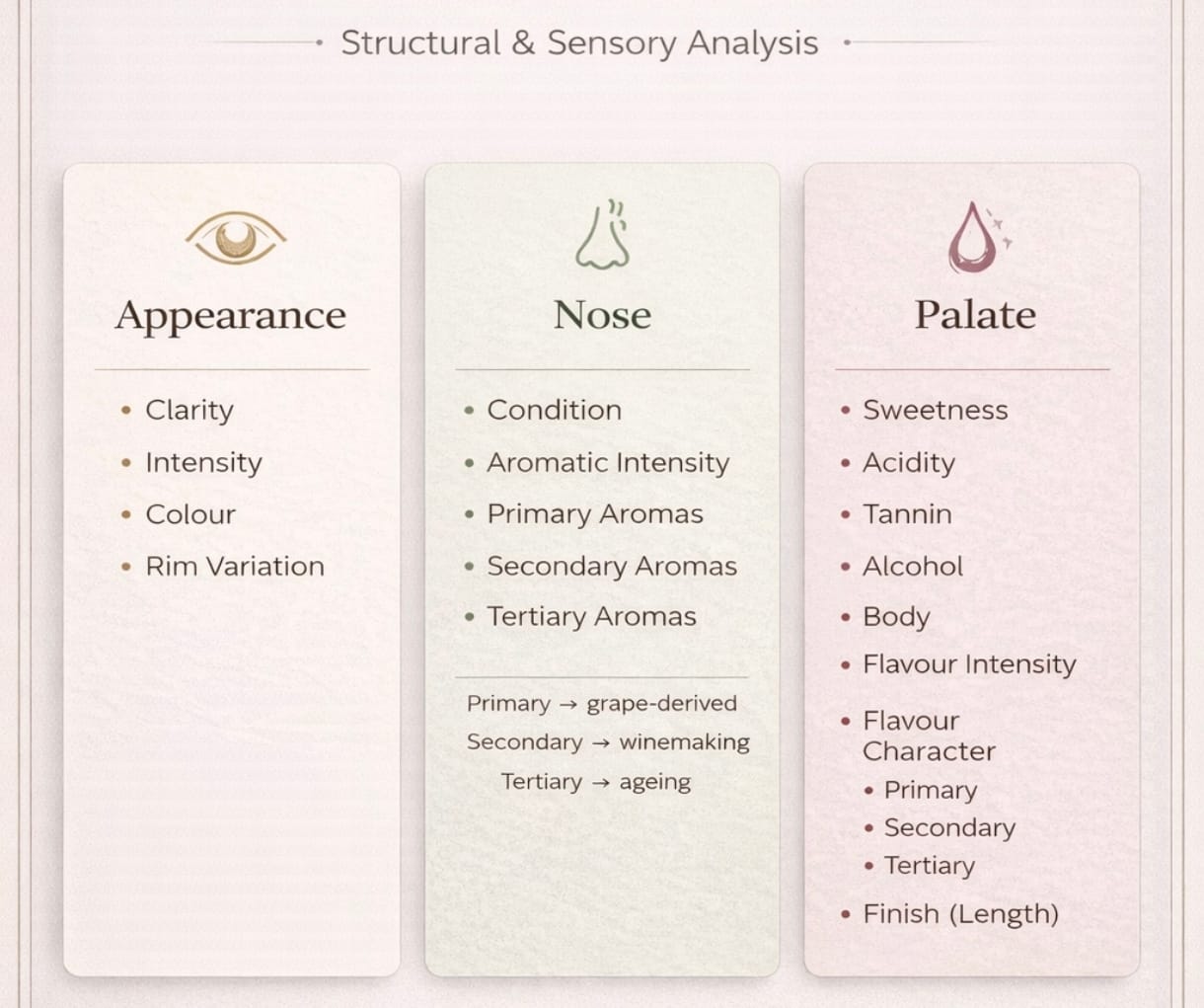 Aromalar genellikle üç düzeyde değerlendirilir: Birincil aromalar (üzüm ve meyve kaynaklı), İkincil aromalar (fermantasyon ve üretim süreci kaynaklı), Üçüncül aromalar (olgunlaşma ve zamanla gelişen notalar).